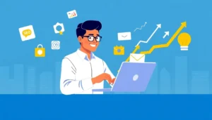 Illustration showing a professional working on a laptop with online icons like email, analytics, social media, and charts, explaining how digital marketing works as a complete beginner’s guide.